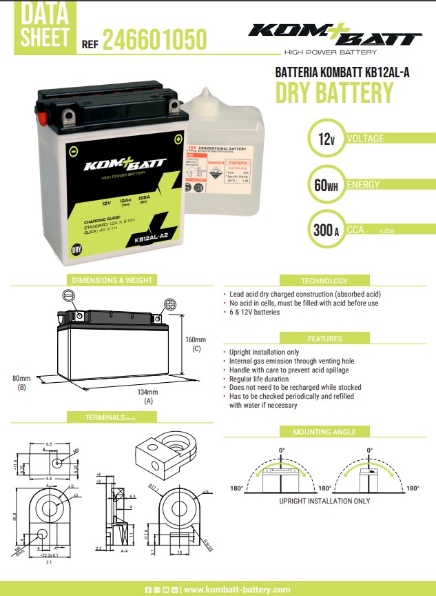 La batería de moto KB12AL-A (YB12AL-A / YB12AL-A2) KOMBATT destaca por su fiabilidad y rendimiento, fruto de la experiencia técnica de la oficina de I+D italiana de Kom+Batt. Diseñada para ofrecer una excelente relación calidad-precio, es una opción robusta y duradera para motoristas que buscan potencia, estabilidad y un producto de calidad certificada.