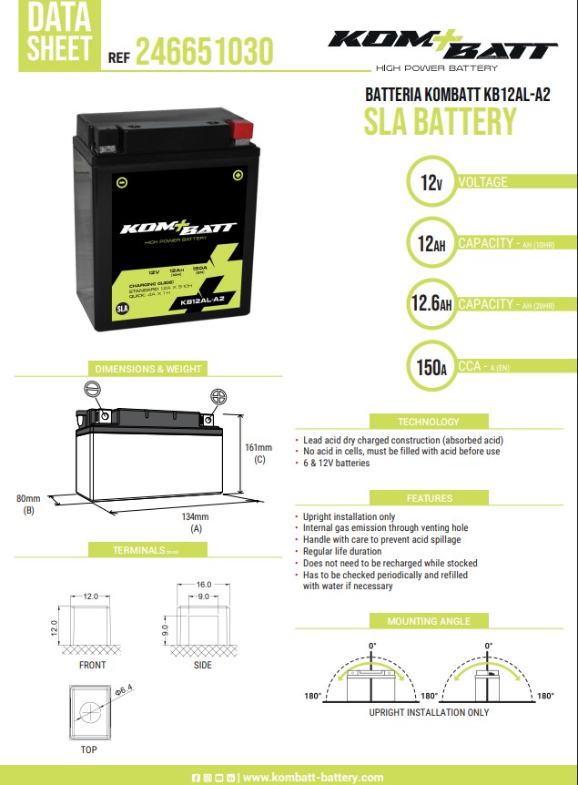 La batería de moto KB12AL-A2 (YB12AL-A2) SLA GEL KOMBATT combina la fiabilidad de la tecnología GEL con la experiencia técnica de la oficina de I+D italiana de Kom+Batt. Diseñada para ofrecer un alto rendimiento, estabilidad y una excelente relación calidad-precio, esta batería es ideal para motoristas que buscan un producto duradero, seguro y sin mantenimiento.