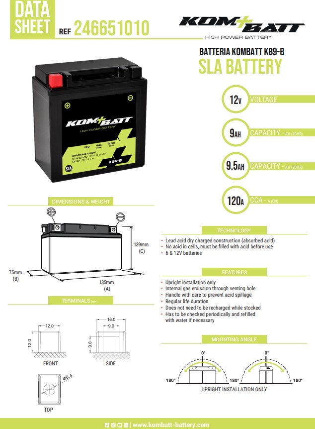 La batería de moto KB9-B (YB9-B) SLA GEL KOMBATT está diseñada para ofrecer fiabilidad, potencia y seguridad gracias a la tecnología GEL y al desarrollo técnico de la oficina de I+D italiana. KOMBATT ofrece soluciones innovadoras con una excelente relación calidad-precio, adaptadas a las necesidades de los motoristas que buscan una batería duradera y sin complicaciones.