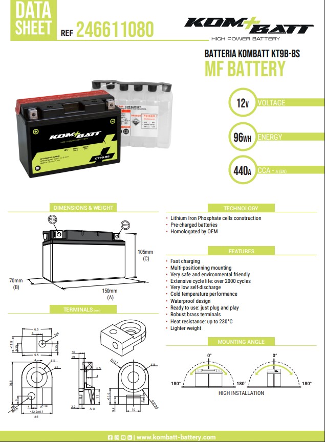 La batería de moto KT9B-BS (YT9B-BS) KOMBATT es una batería DRY sellada sin mantenimiento diseñada para ofrecer potencia estable, arranques fiables y una durabilidad superior. Fabricada bajo los estrictos estándares ISO 9001, ISO 14001 y TS 16949, asegura un rendimiento seguro, constante y resistente al uso intensivo.