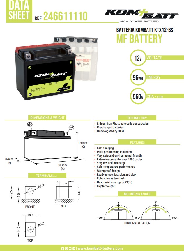 La batería de moto KTX12-BS (YTX12-BS) KOMBATT es una batería DRY sellada sin mantenimiento diseñada para ofrecer un rendimiento fiable, una gran potencia de arranque y una vida útil prolongada. Fabricada bajo procesos certificados ISO 9001, ISO 14001 y TS 16949, garantiza máxima calidad, seguridad y estabilidad incluso en condiciones exigentes.