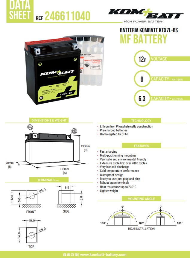 La batería de moto KTX7L-BS (YTX7L-BS) KOMBATT es una batería DRY sellada sin mantenimiento diseñada para ofrecer un arranque estable, buena potencia y una larga vida útil. Fabricada bajo rigurosos estándares ISO 9001, ISO 14001 y TS 16949, asegura fiabilidad, seguridad y un rendimiento constante, incluso en condiciones de uso intensivo.