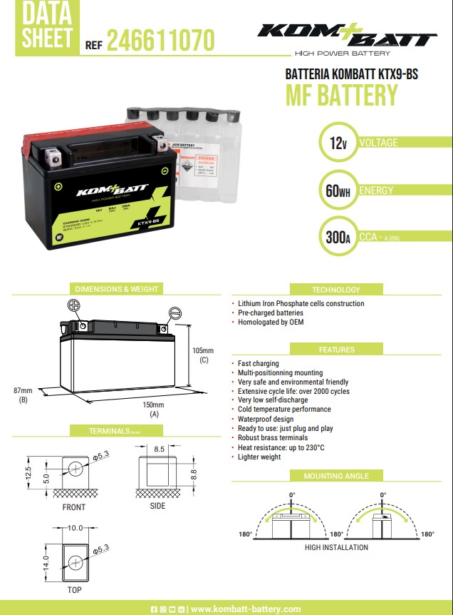 La batería de moto KTX9-BS (YTX9-BS) KOMBATT es una batería DRY sellada sin mantenimiento diseñada para ofrecer una combinación perfecta de potencia, durabilidad y fiabilidad. Desarrollada con la experiencia técnica del departamento de I+D italiano de Kom+Batt y fabricada mediante procesos certificados ISO 9001, ISO 14001 y TS 16949, garantiza un producto seguro, estable y de excelente rendimiento.