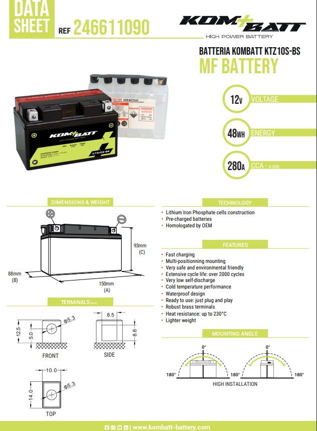 La batería de moto KTZ10S-BS (YTZ10S-BS) KOMBATT es una batería DRY sellada sin mantenimiento diseñada para ofrecer un rendimiento superior, gran potencia de arranque y una durabilidad prolongada. Desarrollada con el soporte técnico del departamento de I+D italiano de Kom+Batt y fabricada bajo los estándares ISO 9001, ISO 14001 y TS 16949, proporciona un producto fiable, seguro y robusto.