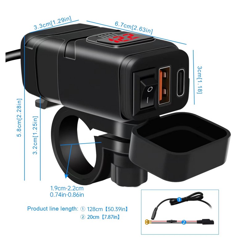 Voltímetro LED e interruptor de encendido/apagado: El cargador USB dispone de un voltímetro incorporado. Monitoriza la batería y el sistema eléctrico automáticamente, sabrás el estado de la batería en todo momento. Se indica el voltaje en la pantalla mediante el interruptor de encendido/apagado.