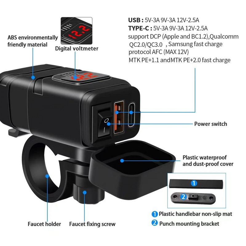 Cargador de móvil para moto, tipo USB-A y USB-C: Cargador para moto a USB con un interruptor de alimentación independiente. Tapa de goma resistente al agua y al polvo, protege los circuitos internos y mejora eficazmente su vida útil.