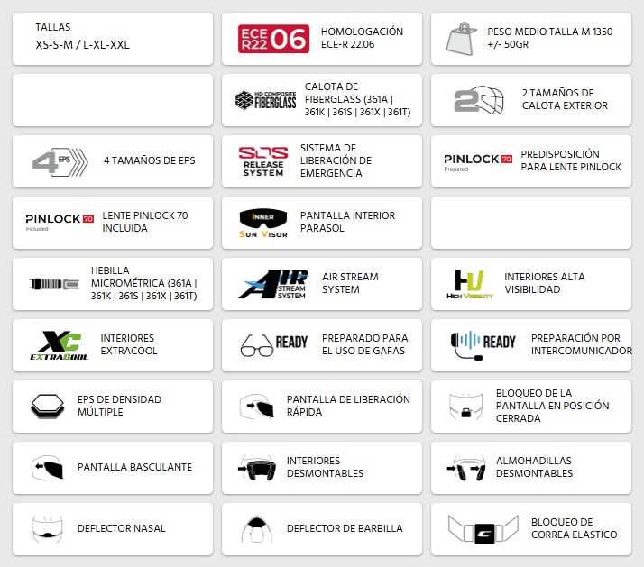 El 361 Avent integra además cierre micrométrico metálico, deflector de barbilla para mayor estabilidad, deflector nasal, bloqueo de correa elástico y predisposición para intercomunicador. Incluye pantalla de liberación rápida, apertura parcial, cierre magnético y compatibilidad con pantallas intercambiables. Su peso medio en talla M es de 1400 ± 50 g, con 4 tamaños de EPSEPS de densidad múltiple y una construcción optimizada para ofrecer un equilibrio ideal entre protección y comodidad.