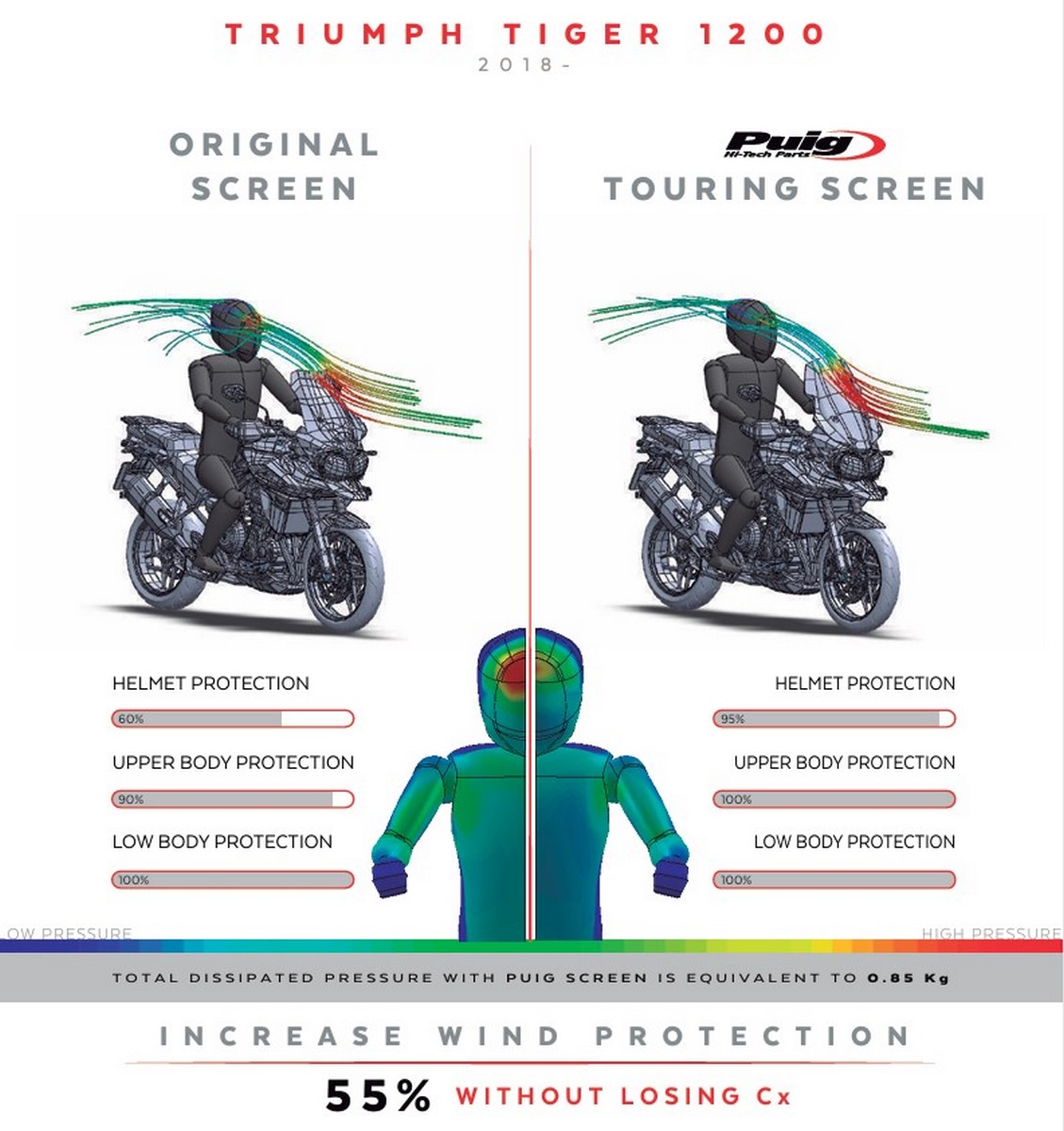 Las cúpulas Touring de PUIG han sido desarrolladas mediante estudios comparativos en túnel de viento virtual, optimizando el flujo de aire para reducir turbulencias en casco y hombros. Esto se traduce en menor fatiga en